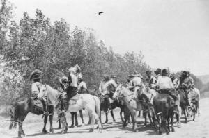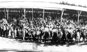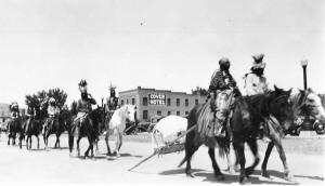 In 1932, The Pioneer Association made serious plans for a historically accurate Gift of the Waters Pageant. Three Hundred Fifty Arapahoe Indians made a grand entry through town and camped at the fairgrounds. An all Indian show was held at the fairgrounds featuring fancy riding, roping, horse milking and races of all kinds. 1933 brought a closing of the Crosby coal mines. With 357 families on relief, the National Recovery act was endorsed by a group in the packed Courtroom. In spite of public debt increasing to $483,859,000, a rodeo was held at the Fuller place on Copper Mountain. These “Night Herd” rodeos continued through August of 1934.