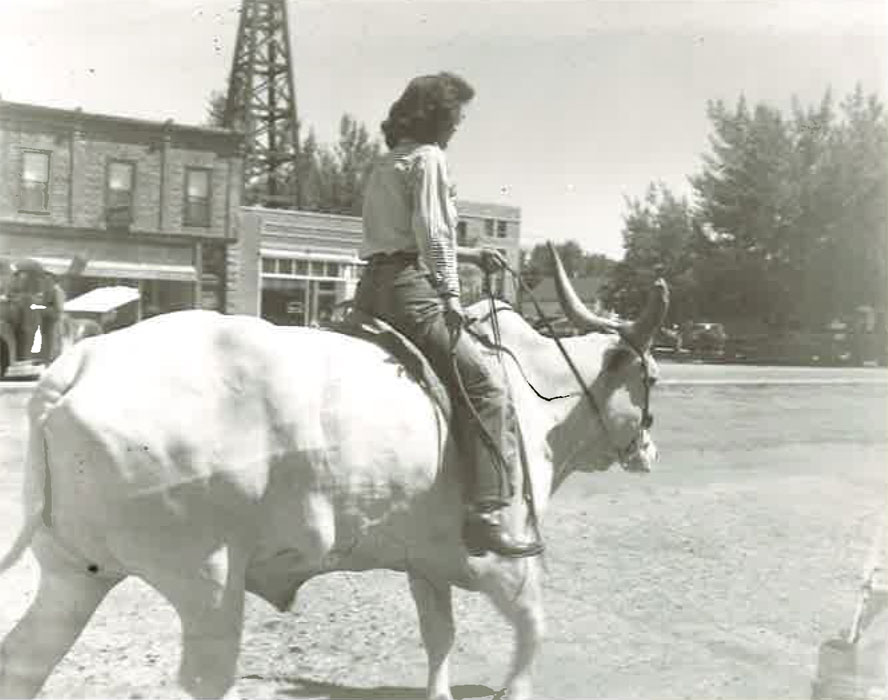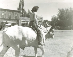 the date was switched to Labor Day. There were many events held including saddle and bare back bronc riding, steer riding, bulldogging, calf roping. Several events were held in the arena at once. The local paper announced, “The jails are ready for the rodeo crowd.” The first rodeo queen selection was held in 1936. Mary Jane Carter won the crown. Another successful rodeo was held September 10, 1937, it was announced by Milward Simpson, and the rodeo committee brought Roy Hammon from Salinas California to clown the event. The Thermopolis Rodeo continued to grow thanks to American Legion support. The year 1938 boasted $1,800 in cash prizes and $500 in merchandise, night show/rodeo, pioneer pageant and daily parades, open air dancing and swimming every night. Diamond D. Dewey, rodeo clown, featured “Panther” the world’s only trained buffalo. This was a big time event and according to the local newspaper was “the first time Brahma bulls will be used